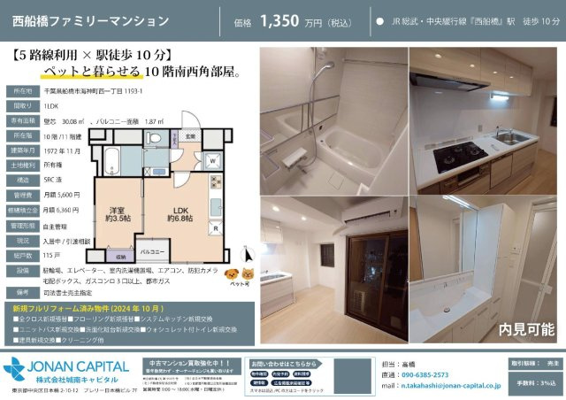 - 船橋市エリアでの住まいなら、住み心地も快適な「西船橋ファミリーマンション」はいかがでしょうか。11階建てで街並みにも合ったおすすめの物件です。駅から徒歩10分の物件です。住み心地も充実した、きれいな中古マンションです。船橋市で快適な物件をお探しなら、西船橋周辺でお求め下さい。生活に欠かせない施設が揃っているので快適に暮らせます。不動産のことなら、お気軽に当社へお問い合わせ下さい。
